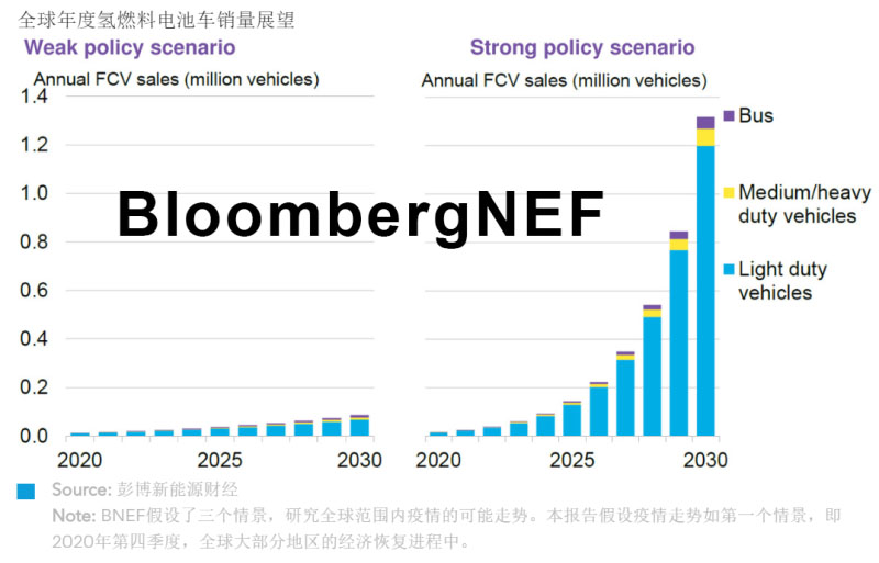 展望:為預(yù)估2030年的氫燃料電池車部署情況,BNEF分別在兩個情景中對其經(jīng)濟性作出分析:一個政策扶持力度較弱的場景(假設(shè)現(xiàn)有政策不變)和一個政策扶持力度較強的場景(將當(dāng)今最佳政策措施大范圍推廣)。雖然我們的經(jīng)濟性分析表明,長途重型運輸是燃料電池車的最佳應(yīng)用場景,但在兩種情景中,我們還是認(rèn)為燃料電池輕型汽車在氫燃料電池車銷量中的占比最大。雖然結(jié)果看似很矛盾,但并非無跡可尋:現(xiàn)有政策和企業(yè)燃料電池車發(fā)展戰(zhàn)略重點是輕型汽車,以便實現(xiàn)燃料電池車的規(guī)?;圃?。
