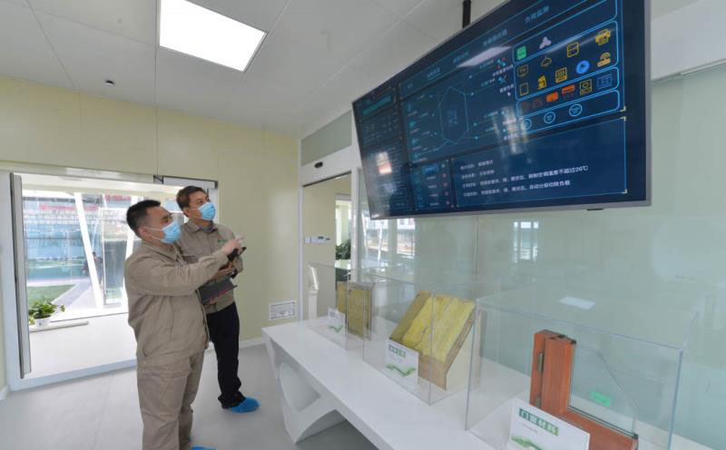 這座135平方米的“0+小屋”,最大限度利用了屋頂、路面等可用空間,鋪設(shè)了60塊光伏板,光照條件較好情況下,每天可發(fā)出60度電,完全做到了建筑用能自給自足,并實(shí)現(xiàn)余電上網(wǎng),成為區(qū)域分布式電源。同時(shí)配備了零能耗建筑運(yùn)行管理系統(tǒng)和40千瓦時(shí)的儲(chǔ)能設(shè)備,光伏產(chǎn)生的電能可以儲(chǔ)存起來(lái),在夜間和光照不足情況下向建筑內(nèi)用電設(shè)備進(jìn)行放電。通過(guò)創(chuàng)新研發(fā)應(yīng)用家庭能源路由器,實(shí)現(xiàn)綜合能源控制,可以在電量富余情況下,適時(shí)啟動(dòng)調(diào)節(jié)熱水器、洗衣機(jī)等,將電能轉(zhuǎn)換為熱能進(jìn)行儲(chǔ)存,自動(dòng)完成預(yù)定家務(wù)。