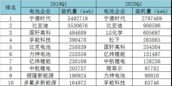 受疫情影響,2020年Q1動力電池整體競爭格局發(fā)生較大變化,TOP10裝機排名較去年同期變動較大。