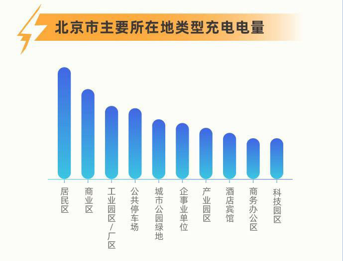 大數(shù)據(jù)分析,北京充電量位居前四的場(chǎng)地是居民區(qū)、商業(yè)區(qū)、工業(yè)園區(qū)/廠區(qū)、公共停車場(chǎng)。其中居民區(qū)公用充電設(shè)施是充電電量最高的所在地類型??磥?lái)大家還是習(xí)慣在家附近充電,畢竟去商業(yè)區(qū)還得產(chǎn)生更多消費(fèi)。