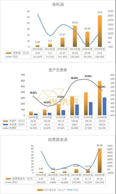 羅馬并非一日建成,隆基用6年的時(shí)間,證明了單晶路線的正確性,同時(shí)也見證了整個(gè)光伏產(chǎn)業(yè)發(fā)生的巨大變化:多晶陣營(yíng)苦苦維系在被淘汰的邊緣、PERC技術(shù)獨(dú)擋潮流……在這六年里,隆基將營(yíng)收從2014年的36.8億元提高至2019年的329億,幾乎翻了10倍;凈利潤(rùn)方面,也一直是光伏企業(yè)的佼佼者,2019年更是史無(wú)前例的達(dá)到52.8億元;隨著應(yīng)收賬款的優(yōu)化,2019年企業(yè)經(jīng)營(yíng)現(xiàn)金流暴增近6倍。