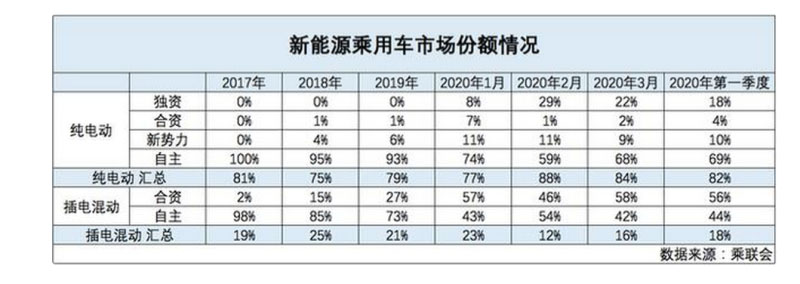 隨著特斯拉正式在國內(nèi)交付,新能源乘用車市場形成四大“派系”,分別是獨(dú)資車企、合資車企、造車新勢力和自主品牌傳統(tǒng)車企,在2020年之前自主品牌傳統(tǒng)車企向來是一家獨(dú)大,市占率達(dá)到90%以上,然而進(jìn)入2020年,自主品牌傳統(tǒng)車企的市場份額卻正在被大肆蠶食。