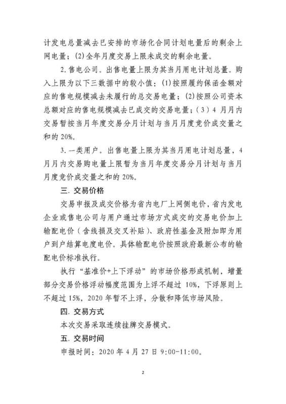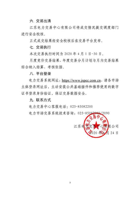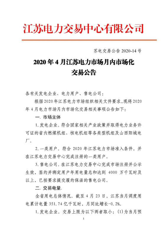 2020年4月江蘇電力市場月內(nèi)市場化交易公告