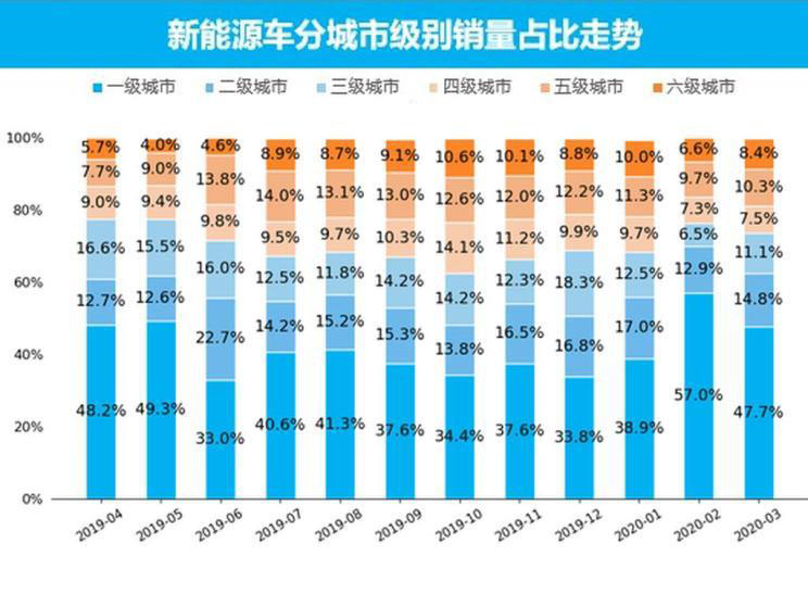 3月新能源車銷量最高的城市級別為一級城市,銷量為2.2萬輛,銷量占比為47.7%,比上個月下跌了9.3個百分點;與去年同期相比,一級城市上漲2.4個百分點,高線級城市配套設(shè)施完善,直接影響到新能源車的銷量走勢。銷量最低的城市級別為四級城市,銷量僅為0.4萬輛,銷量占比為7.5%,比上個月上漲了0.2個百分點;與去年同期相比,四級城市上漲0.2個百分點,隨著新戶籍政策的放開及高線級城市購車限號的影響,低線級會帶來新的一輪新能源銷量熱潮。
