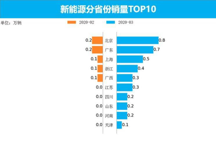 3月新能源車銷量最高的5個省份為北京、廣東、上海、浙江、江蘇,銷量分別為0.8萬輛、0.7萬輛、0.5萬輛、0.4萬輛、0.3萬輛,占總銷量的59.2%。與上個月相比,上漲幅度最高的三個省份為新疆、內(nèi)蒙古、陜西,上漲幅度分別為8900.0%、3300.0%、1632.6%,未來經(jīng)濟發(fā)展型省份的新能源市場優(yōu)勢或會進一步擴大。