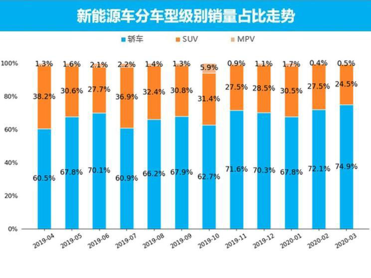 從整體新能源市場銷量情況來看,2020年3月,新能源車共銷售了4.7萬輛,占整個市場銷量的4.5%。與上個月相比,新能源車銷量環(huán)比增長388.2%,這一方面受益于新冠肺炎疫情的持續(xù)改善;另一方面,受汽車市場季節(jié)性與周期性的影響,經(jīng)銷商受到一季度末沖量壓力,3月銷量大幅提升。不過,與去年同期相比,新能源車銷量同比下跌49.1%,在整體市場持續(xù)低迷和經(jīng)濟低速增長的大環(huán)境下,新能源車增長動力不足,銷量增速逐漸收窄,增長幅度為近12個月以來第二低。