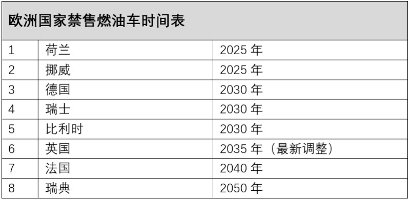 表1:歐洲各國禁售燃油車時(shí)間表,中國電動(dòng)汽車百人會(huì)信息部整理