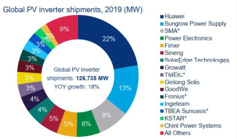 近日,能源調(diào)研機(jī)構(gòu)Wood Mackenzie發(fā)布了《全球太陽能光伏逆變器市場(chǎng):2020年市場(chǎng)份額和出貨量趨勢(shì)報(bào)告》,2019年全球逆變器的出貨量為126.735GW,同比增長(zhǎng)18%。各品牌占比如下圖所示。
