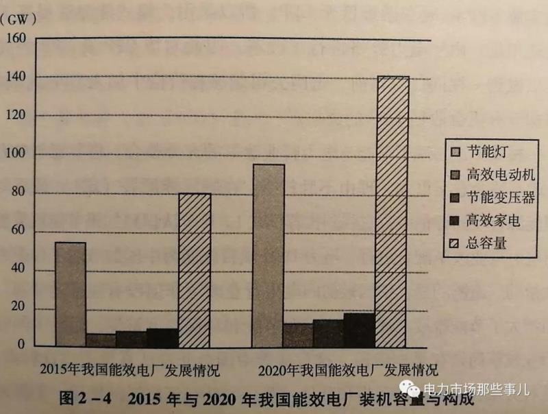 我國(guó)的能效支持政策早于電改5號(hào)文,在江蘇、廣東、河北、四川等省也進(jìn)行了嘗試。2012年,《中國(guó)能源政策白皮書》提出了雙控指標(biāo),對(duì)能源消費(fèi)總量和消費(fèi)強(qiáng)度提出了約束性要求。國(guó)網(wǎng)能源研究院《能效電廠建設(shè)途徑和方法研究》對(duì)前景進(jìn)行了展望,提出2020年EPP在中國(guó)總裝機(jī)的比重將達(dá)到8%,結(jié)構(gòu)如下圖: