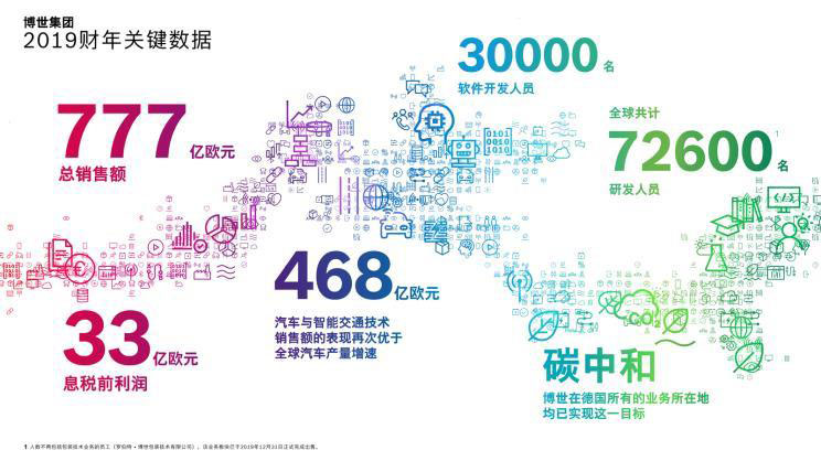 回顧2019財(cái)年,在全球經(jīng)濟(jì)發(fā)展持續(xù)低迷和汽車產(chǎn)量下降5.5%的大環(huán)境下,博世集團(tuán)整體銷售額達(dá)777億歐元(約5967億元人民幣),息稅前利潤總計(jì)33億歐元(約253億元人民幣)。2019年博世集團(tuán)研發(fā)支出61億歐元(約468億元人民幣),占整體銷售額7.8%。