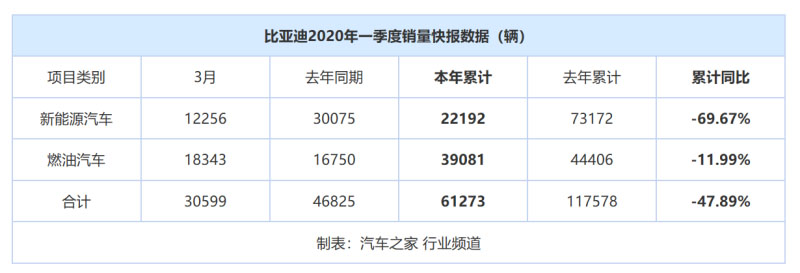 比亞迪表示,2020年第一季度,新冠疫情及宏觀經(jīng)濟(jì)下行對汽車行業(yè)整體市場需求沖擊較大,公司新能源汽車銷量較去年同期有較大幅度下滑。一季度,比亞迪累計銷量為61273輛,同比降低47.89%。相對而言,新能源車銷量下滑更為明顯,一季度共銷售22192輛,同比下降-69.67%;燃油車一季度銷售39081輛,同比下降11.99%。