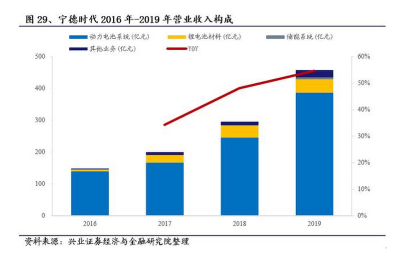 公司為全球鋰電池龍頭企業(yè),尤其在動力電池行業(yè),2019年市占率高達52%,同比提升11%。2019年公司實現(xiàn)營業(yè)收入458億元,同比增長54.6%,其中動力電池系統(tǒng)實現(xiàn)營收386億元,占比84.3%,同比增加57%。鋰電材料實現(xiàn)營收43.1億元,占比9.4%,同比增加11.5%,儲能系統(tǒng)實現(xiàn)營收6.1億元,占比1.3%,同比增速221.94%。