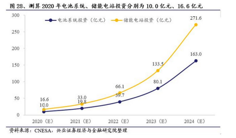 儲能投資測算:基于2020年初的中標價情況,儲能電池系統(tǒng)約1.2元/kWh,儲能電站整體投資約2元/kWh,測算2020年電池系統(tǒng)、儲能電站投資分別約10.0億元、16.6億元,2024年上述投資分別約163.0億元、271.6億元。