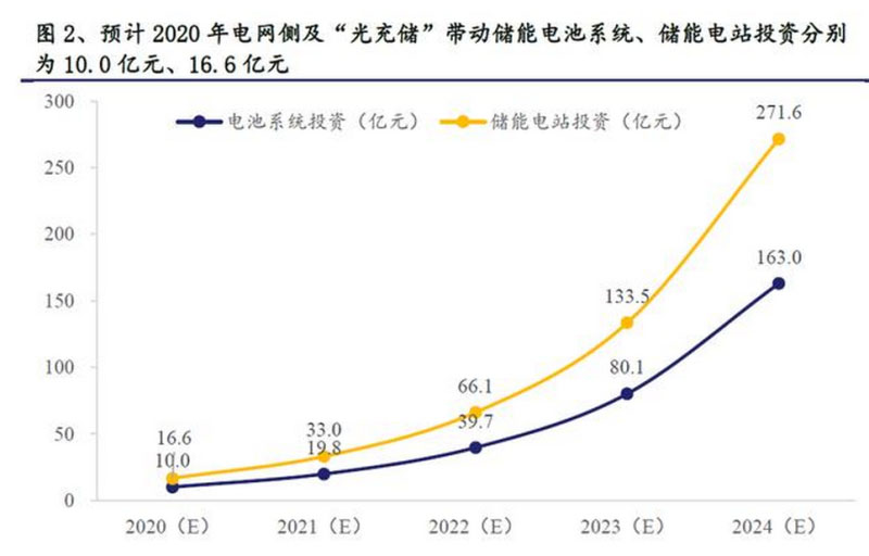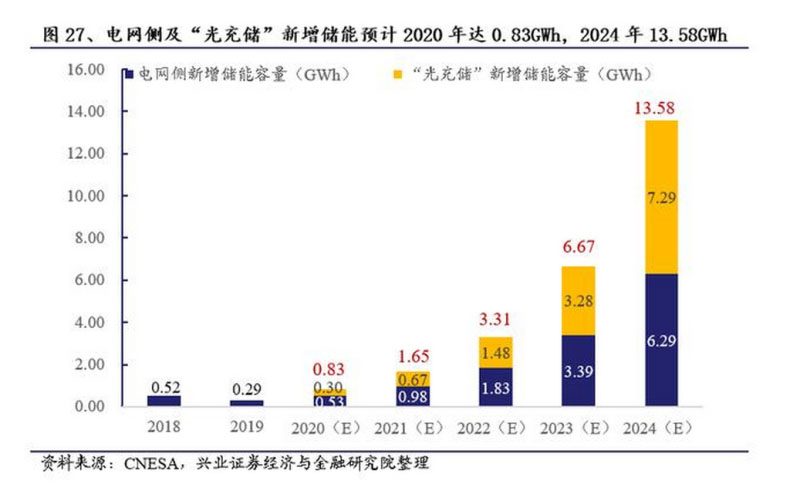 儲能容量測算:在不考慮其他類型電化學(xué)儲能的貢獻情況下,僅考慮電網(wǎng)側(cè)及“光充儲”儲能二者之和,預(yù)計2020年新增0.83GWh,2024年新增13.58GWh。