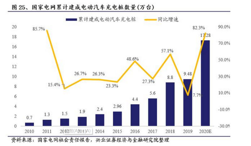 4月14日,國家電網(wǎng)召開2020年全面建設(shè)新能源汽車充電設(shè)施項目集中聯(lián)動開工視頻會議,計劃安排充電樁建設(shè)投資27億元,新增充電樁7.8萬個,除公用和專用充電樁2.5萬個外,建設(shè)居住區(qū)充電樁5.3萬個,全面推廣居民區(qū)智能有序充電。在“新基建”加碼的背景下,國網(wǎng)充電樁建設(shè)重回快車道,預(yù)計至2020年底國網(wǎng)累計建成充電樁數(shù)量17.28萬臺,同比增速82.3%。