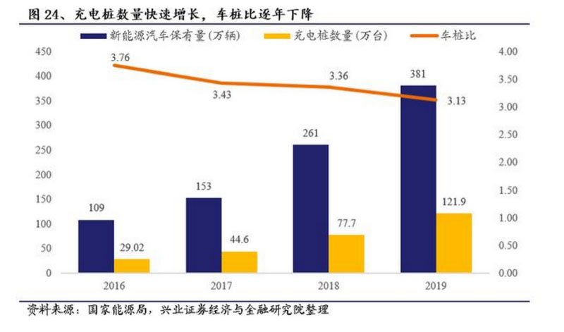 我國新能源汽車及充電樁保有量迅速增長,截至2019年底,充電樁數(shù)量已達122萬臺,車樁比下降至3.13,鑒于未來新能源汽車數(shù)量持續(xù)增加以及車樁比進一步下降的趨勢,充電樁數(shù)量勢必會大幅增長,據(jù)發(fā)改委制定的發(fā)展目標,未來中國的總體充電樁保有量將達到480萬個,以滿足500萬輛電動汽車的出行要求。