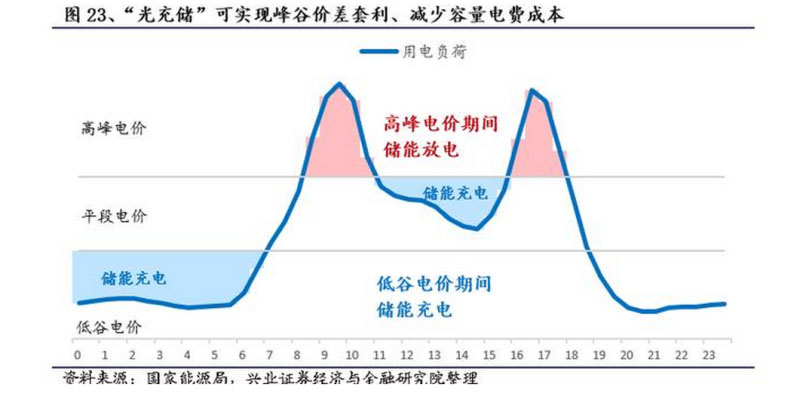 2)“光充儲”一體化配套儲能前景可觀。兩種盈利模式:峰谷價差套利+減少容量電費成本。我國對于大容量工商業(yè)用電實行“容量電費+電量電費”模式,通過配置儲能,一方面通過儲能在低谷電價時充電,高峰電價時放電可減少電量電費,另一方面由于用電負荷的高峰用電時段一般時間很短,通過配置削減用電負荷的“高峰段”,可以減少容量電費成本。