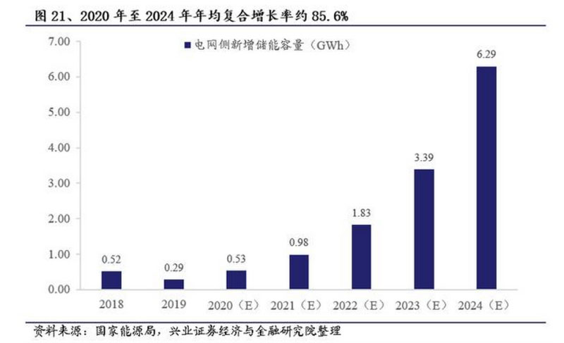 據(jù)中關(guān)村儲能協(xié)會CNESA統(tǒng)計,2018年、2019年的電網(wǎng)側(cè)新增儲能功率分別為207MW、114MW,我們按平均儲能時長2.5小時估算其容量,進一步測算2020年2024年的中性預(yù)測下儲能的年均復(fù)合增長率,約為85.6%。