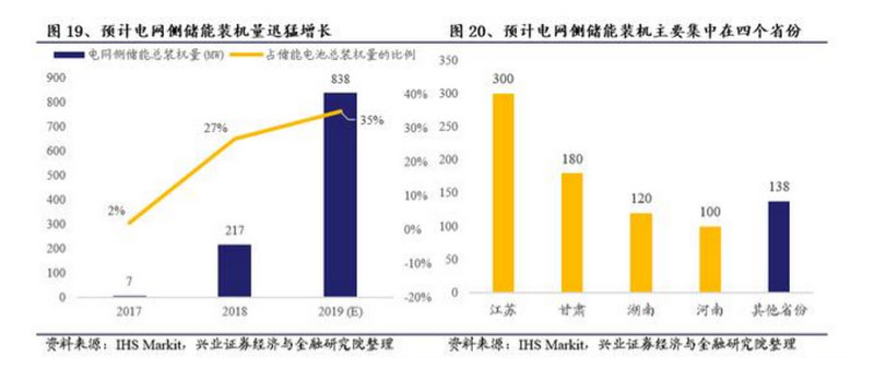 近兩年來,隨著各地電網(wǎng)側(cè)儲能項目的紛紛落地并網(wǎng),電網(wǎng)側(cè)儲能規(guī)模在2018年曾實現(xiàn)爆發(fā)性增長,根據(jù)CNESA儲能項目數(shù)據(jù)庫的統(tǒng)計,2018年新增電網(wǎng)側(cè)電化學(xué)儲能規(guī)模206.8MW,占2018年全國新增投運電化學(xué)儲能規(guī)模的36%。IHS Markit曾在2019年6月預(yù)計至2019年底有望達到838MW,占儲能電池總裝機的比例提升至35%,居各類儲能應(yīng)用之首,這些項目將主要集中在江蘇、湖南、河南和甘肅四個省份,其他省份裝機總量雖小但普遍存在電網(wǎng)側(cè)儲能大需求,電網(wǎng)側(cè)儲能未來裝機潛力巨大。