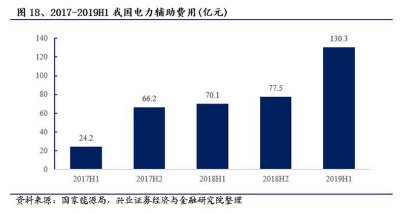 2017年至今,我國電力輔助服務(wù)費用快速增長,2019年上半年輔助服務(wù)補償費用總額為130.31億元,比2018年同期增長85.9%,補償費用占上網(wǎng)電費總額的1.47%,比2018年同期增長0.6%,電力輔助服務(wù)市場潛力巨大。未來電網(wǎng)側(cè)儲能不僅可在輔助服務(wù)市場中分一杯羹,利好政策也將擴大其對補償費用的占有比例。