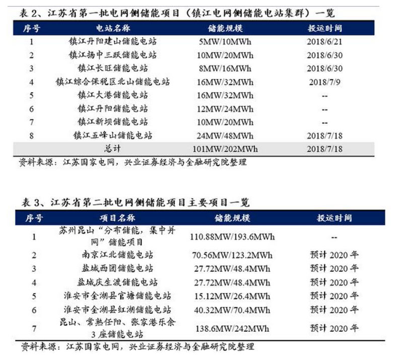 江蘇國家電網(wǎng)自2018年至今已規(guī)劃兩批電網(wǎng)側(cè)儲能項目,第一批為鎮(zhèn)江電網(wǎng)側(cè)儲能電站集群,在鎮(zhèn)江的3個地區(qū)建設(shè)8個儲能電站,總規(guī)模為101MW/202MWh,已于2018年7月18日建成投運;第二批電網(wǎng)側(cè)儲能項目計劃在南京、蘇州等5個地區(qū)建設(shè)10個儲能電站,總?cè)萘窟_752.6MW,預(yù)計于2020年建成投運,其中南京江北儲能電站已于2019年3月6日開工建設(shè),該儲能電站最大充放電功率可達13.088萬千瓦,總存儲容量26.86萬千瓦時,是目前國內(nèi)容量最大、功率最高的電化學(xué)儲能電站,也是我國首個梯次利用的電網(wǎng)側(cè)儲能電站。