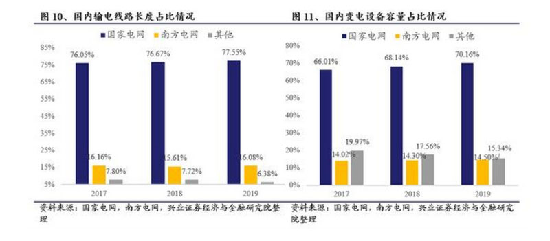 目前國網(wǎng)已在電網(wǎng)側(cè)占據(jù)壟斷地位。2019年國網(wǎng)輸電線路長度占國內(nèi)總長度的77.55%,變電設(shè)備容量占國內(nèi)總?cè)萘康?0.16%,占有率遠遠超過第二名南方電網(wǎng),行業(yè)龍頭地位顯著。電網(wǎng)側(cè)行業(yè)集中度極高且有繼續(xù)提高的趨勢,國網(wǎng)的壟斷地位很難動搖。