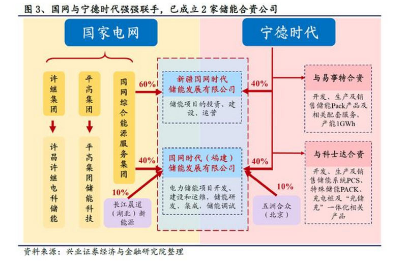 2020年1月以來,國家電網(wǎng)旗下國網(wǎng)綜合能源服務(wù)集團有限公司與寧德時代接連在新疆和福建成立合資公司。1月7日成立的新疆國網(wǎng)時代儲能發(fā)展有限公司是兩家公司成立的首個儲能合資公司,注冊資本3000萬元,其中國網(wǎng)綜能持股60%,寧德時代持股40%,公司主營儲能項目的投資、建設(shè)和運營;4月3日,國網(wǎng)與寧德時代再次聯(lián)手,國網(wǎng)時代(福建)儲能發(fā)展有限公司宣告成立,公司注冊資本4億元,寧德時代和國網(wǎng)綜能各持股40%,主營業(yè)務(wù)包括電力儲能項目開發(fā)、建設(shè)和運維、技術(shù)服務(wù)等,為綜合能源服務(wù)提供儲能專業(yè)解決方案。