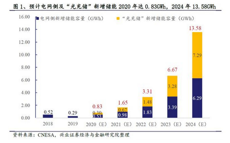 儲能規(guī)模測算:在不考慮其他類型電化學(xué)儲能的貢獻情況下,僅考慮國家電網(wǎng)覆蓋業(yè)務(wù)范圍內(nèi)的電網(wǎng)側(cè)及“光充儲”儲能,預(yù)計2020年新增需求0.83GWh,2024年可達13.58GWh。