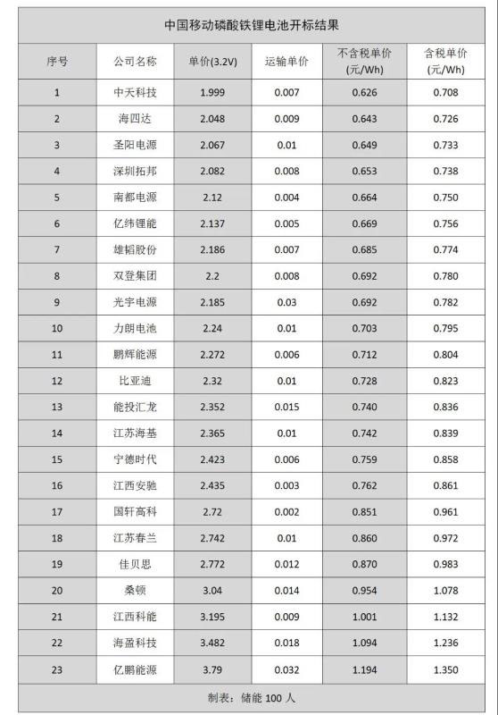 根據(jù)招標(biāo)公告,中國(guó)移動(dòng)本次對(duì)磷酸鐵鋰的采購(gòu)需求量超過(guò)1.9GWh,按照25.08億元的最高投標(biāo)價(jià)格計(jì)算,每Wh的價(jià)格約1.2元,實(shí)為最高限價(jià)。
