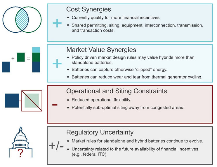 將可再生能源發(fā)電設(shè)施和電池儲能系統(tǒng)共址部署可以節(jié)省共享設(shè)備和互連成本,并可以充分利用有利于太陽能發(fā)電設(shè)施和電池儲能系統(tǒng)配套部署的美國聯(lián)邦稅收抵免政策。相對于獨(dú)立部署的發(fā)電設(shè)施,電力系統(tǒng)運(yùn)營商和購買者可能更喜歡應(yīng)用混合部署的發(fā)電設(shè)施,因為它們具有更大的調(diào)度靈活性。但是將發(fā)電設(shè)施和電池儲能系統(tǒng)共址部署,可能并不總是一個最佳的解決方案。