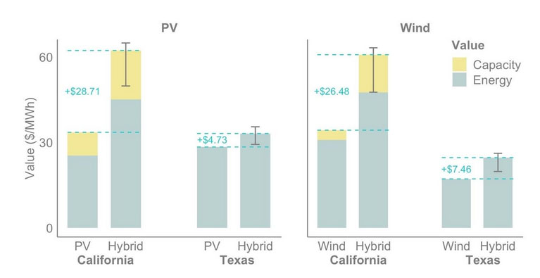 但是,能源開發(fā)商是否由于提供容量或只是采用可再生能源而獲得收益,這是混合部署能源設(shè)施能否獲得經(jīng)濟(jì)效益的一個重要因素。在電網(wǎng)規(guī)模的太陽能發(fā)電項目中,配套部署4小時電池儲能系統(tǒng)的成本為每兆瓦時4~14美元。但是,在加利福尼亞州的綜合能源和容量組合市場中,每兆瓦時的附加值可能高達(dá)13~31美元;但在德克薩斯州的電力市場中,每兆瓦時的附加值可能低至1~9美元。