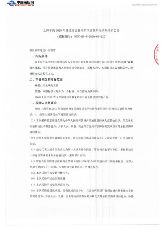 ,3月24日,上海平高發(fā)布2019年儲能站設(shè)備采購項目競爭性談判采購公告,本次招標(biāo)共分為1個標(biāo)段,公告顯示采購設(shè)備包含儲能電池、電池管理系統(tǒng)BMS、預(yù)制艙、儲能變流器PCS、升壓變、匯流柜等。