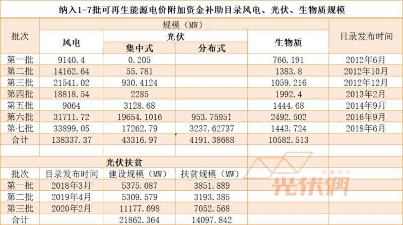 根據(jù)國家能源局數(shù)據(jù),截止2019年底,我國光伏發(fā)電累計裝機容量達204GW,其中進入1-7批補貼目錄的約有光伏61GW(含光伏扶貧)、風電138GW。2018年6月財政部公布了第七批可再生能源補貼目錄,從2014年開始,各批次目錄發(fā)放的時間周期基本在兩年左右。