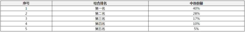 中選人數(shù)量為5個(gè),每個(gè)中選人對(duì)應(yīng)的中選份額如下: