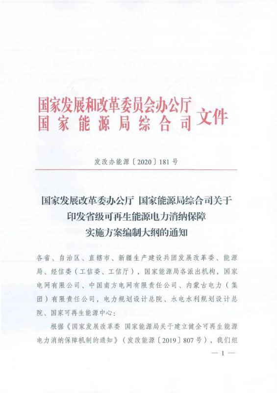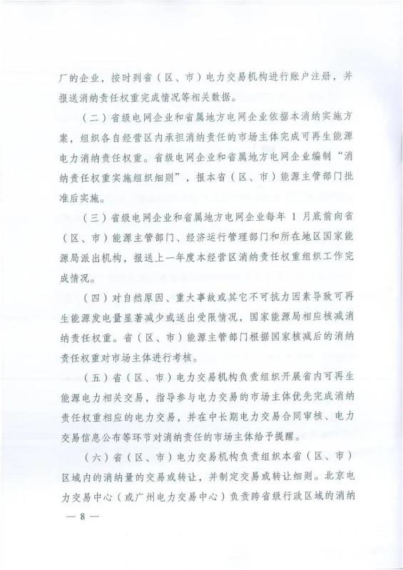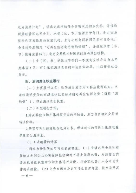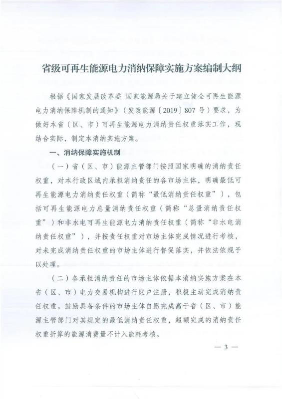 中國儲能網(wǎng)訊:日前,國家發(fā)改委辦公廳、國家能源局綜合司印發(fā)《省級可再生能源電力消納保障實施方案編制大綱的通知》,為省級能源主管部門編制本地區(qū)方案提供參考。根據(jù)大綱,?。▍^(qū)、市)能源主管部門按照國家明確的消納責(zé)任權(quán)重,對行政區(qū)域內(nèi)承擔(dān)消納責(zé)任的各市場主體,明確最低可再生能源電力消納責(zé)任權(quán)重,并按責(zé)任權(quán)重進(jìn)行考核,對未完成的市場主體進(jìn)行督促落實,并依法依規(guī)予以處理。