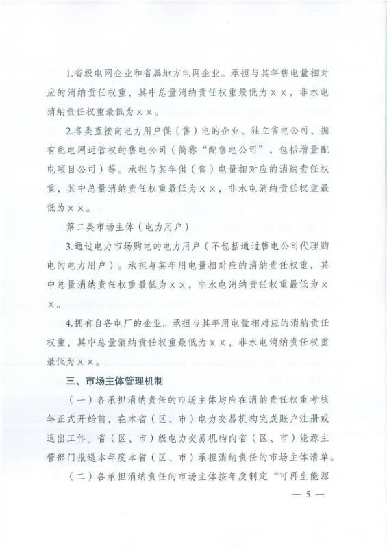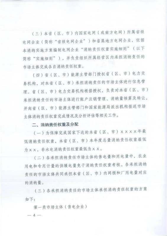 各承擔(dān)消納責(zé)任的市場主體承擔(dān)消納責(zé)任權(quán)重的方案如下:第一類市場主體(售電企業(yè)),第二類電力用戶。