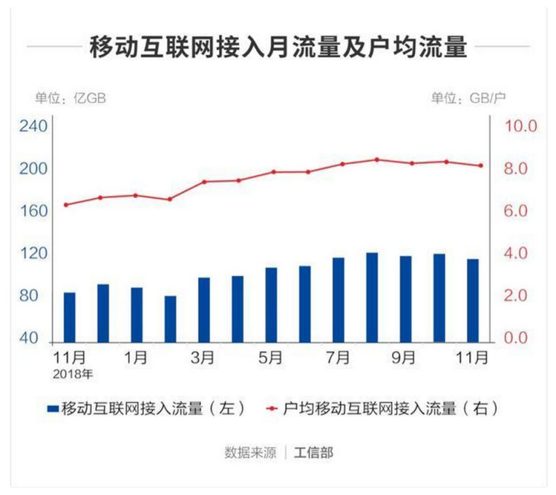在“流量紅利”和“提速降費(fèi)”雙重加持下,4G用戶DOU(平均每個(gè)用戶每月使用的上網(wǎng)流量)提高了7倍以上。