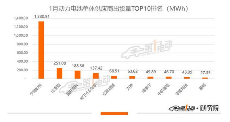 1月寧德時(shí)代裝機(jī)量為1.3GWh,同比下跌37.7%,但市場(chǎng)份額仍維持在高位。