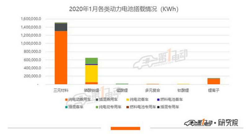 1月三元材料的搭載量為1.5GWh,其中乘用車占比99.1%,三元材料搭載量占總搭載量的65.1%。磷酸鐵鋰電池依然以搭載純電動(dòng)動(dòng)客車為主,1月總搭載量為645.7MWh,在月度裝機(jī)中占比27.9%。