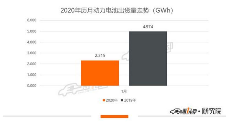 根據(jù)工信部合格證產(chǎn)量數(shù)據(jù),2020年1月共產(chǎn)出新能源汽車48,561輛。根據(jù)第一電動(dòng)研究院的統(tǒng)計(jì)測(cè)算,動(dòng)力電池2020年1月裝機(jī)量約為2.315GWh,同比下降53.46%。