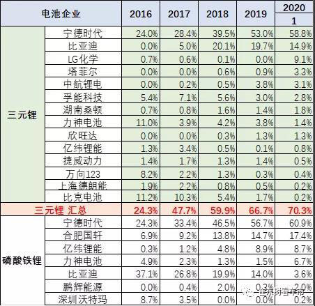 各類車型的電池線路的企業(yè)差異較大。三元和磷酸鐵鋰的線路各有強(qiáng)勢廠家。比亞迪的三元電池的占比在三年內(nèi)上升,19年達(dá)到32%的月度峰值,也是很好的。