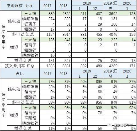 根據(jù)崔東樹個(gè)人測算,2020年1月新能源汽車產(chǎn)量4.8萬臺(tái),同比下降52%;電池裝機(jī)總電量約230萬度,同比下降54%。1月的乘用車電池需求171萬度,同比下降52%,表現(xiàn)偏弱。2019年的三元電池占比達(dá)到64%,較18年上升7個(gè)百分點(diǎn)。20年1月的三元電池占比達(dá)到65%,磷酸鐵鋰大降。。