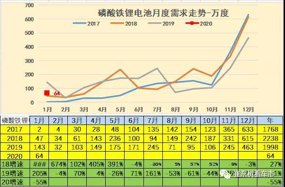 2019年磷酸鐵鋰電池,需求相對比較平穩(wěn)整體需求量達(dá)到1530萬度。相對于2018年同期降低5%。2020年在1月份的電池需求較旺盛。