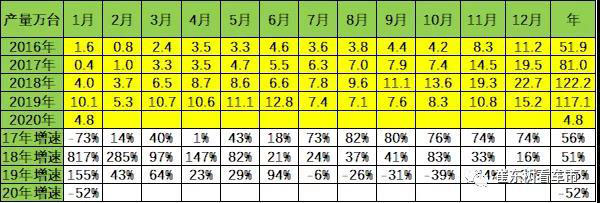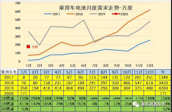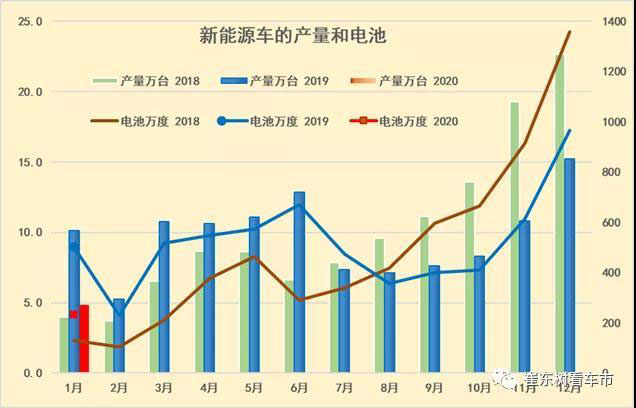 根據(jù)崔東樹個(gè)人測算,按照汽車生產(chǎn)合格證數(shù)據(jù):2020年1月新能源汽車產(chǎn)量4.8萬臺(tái),同比下降52%;電池裝機(jī)總電量約230萬度,同比下降54%,