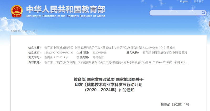 教育部 國(guó)家發(fā)展改革委 國(guó)家能源局關(guān)于印發(fā)《儲(chǔ)能技術(shù)專業(yè)學(xué)科發(fā)展行動(dòng)計(jì)劃(2020—2024年)》的通知