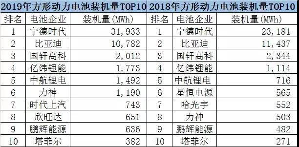 位列2019方形動(dòng)力電池裝機(jī)量TOP10的企業(yè)為(按裝機(jī)電量高低排列):寧德時(shí)代、比亞迪、國(guó)軒高科、億緯鋰能、中航鋰電、力神、時(shí)代上汽、欣旺達(dá)、鵬輝能源、塔菲爾。