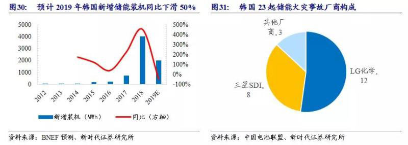 火災(zāi)事故頻發(fā),引發(fā)儲(chǔ)能新增裝機(jī)滑坡。從2017年8月到2019年5月,韓國(guó)總共發(fā)生23起儲(chǔ)能電站火災(zāi),2018年11月一個(gè)月就發(fā)生四起火災(zāi)。韓國(guó)政府不得不在年底組建事故調(diào)查委員會(huì)徹查此事,韓國(guó)儲(chǔ)能產(chǎn)業(yè)也陷入了半年的停滯時(shí)期。根據(jù)調(diào)查結(jié)果,23起火災(zāi)事故中,LG化學(xué)12起,三星SDI 8起,其他廠商3起;其中有14起發(fā)生在充電后,6起發(fā)生在充放電過(guò)程中,3起是在安裝和施工途中發(fā)生火災(zāi)。據(jù)BNEF預(yù)計(jì),2019年韓國(guó)新增儲(chǔ)能裝機(jī)約2GWh,同比下滑50%。