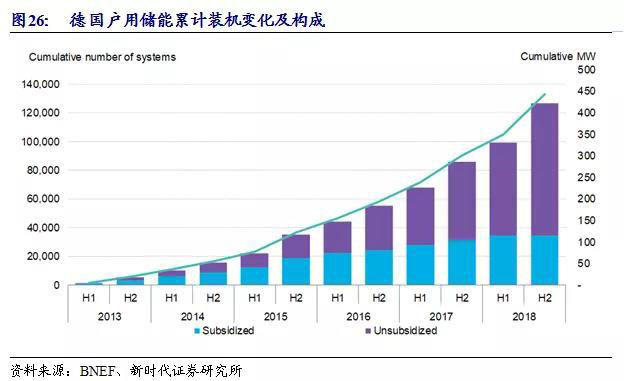 德國(guó):戶用儲(chǔ)能市場(chǎng)發(fā)展成熟。德國(guó)是全球最成熟的戶用儲(chǔ)能市場(chǎng),而戶用儲(chǔ)能是德國(guó)儲(chǔ)能市場(chǎng)的主要構(gòu)成部分,據(jù)CNESA預(yù)計(jì),到2021年戶用儲(chǔ)能將接近德國(guó)儲(chǔ)能總規(guī)模的50%。德國(guó)戶用儲(chǔ)能市場(chǎng)發(fā)展成熟的主要原因包括居民電價(jià)較高和政府補(bǔ)貼。德國(guó)復(fù)興發(fā)展銀行通過(guò)KfW275計(jì)劃,為光伏用戶配套儲(chǔ)能提供補(bǔ)貼,推動(dòng)德國(guó)居民自發(fā)自用,降低電費(fèi)賬單。截至2018年底,德國(guó)戶用儲(chǔ)能累計(jì)裝機(jī)超過(guò)12萬(wàn)套,裝機(jī)容量達(dá)到444MW/882MWh。其中,kfw補(bǔ)貼下的儲(chǔ)能系統(tǒng)超過(guò)3萬(wàn)套,未補(bǔ)貼的超過(guò)9萬(wàn)套。