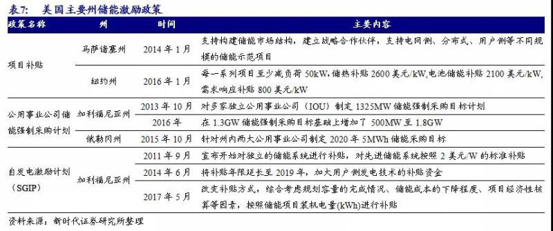 多個(gè)州出臺(tái)儲(chǔ)能激勵(lì)政策,以加州最為突出。除聯(lián)邦政策外,各州也針對(duì)儲(chǔ)能出臺(tái)了相應(yīng)的激勵(lì)政策,其中以加州最為突出。加州公用事業(yè)委員會(huì)(CPUC)自2001年開(kāi)始啟動(dòng)自發(fā)電激勵(lì)計(jì)劃(Self-Generation Incentive Program,SGIP),鼓勵(lì)多種分布式能源,如光伏、風(fēng)電等。自2011年起,儲(chǔ)能被納入SGIP計(jì)劃支持范圍,可獲得2美元/W的補(bǔ)貼。此后,盡管SGIP政策經(jīng)歷了多次調(diào)整和修改,但對(duì)于推動(dòng)加州分布式儲(chǔ)能的發(fā)展,依然發(fā)揮了重要作用。此外,加州通過(guò)制定政策,引導(dǎo)公用事業(yè)公司(IOU)部署儲(chǔ)能項(xiàng)目。2013年,加州公用事業(yè)委員會(huì)(CPUC)設(shè)置了儲(chǔ)能采購(gòu)框架,為加州三大IOU設(shè)定了到2020年部署1.3GW儲(chǔ)能的目標(biāo)。2016年,又在1.3GW目標(biāo)基礎(chǔ)上增加了500MW至1.8GW。預(yù)計(jì)各IOU將在規(guī)定的2024年期限之前就能完成目標(biāo),并且最終采購(gòu)規(guī)模將超過(guò)此前制定的目標(biāo)。
