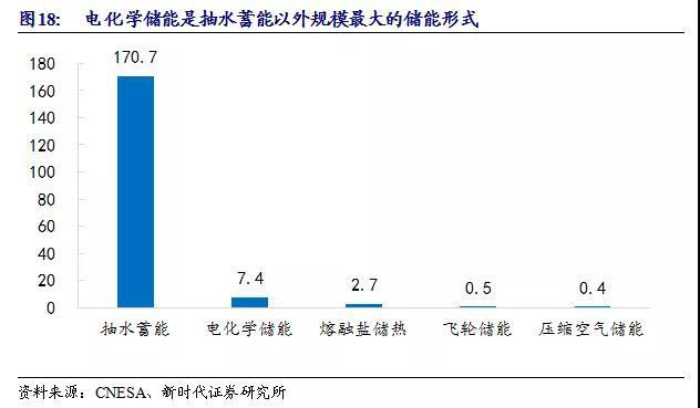 根據(jù)CNESA數(shù)據(jù),截至2019年6月底,全球已投運(yùn)電化學(xué)儲(chǔ)能項(xiàng)目累計(jì)裝機(jī)規(guī)模為181.8GW,其中電化學(xué)儲(chǔ)能累計(jì)裝機(jī)7.43GW,占比4.1%。電化學(xué)儲(chǔ)能成為抽水蓄能以外規(guī)模最大的儲(chǔ)能形式,但整體占比仍然偏小,未來(lái)發(fā)展空間廣闊。